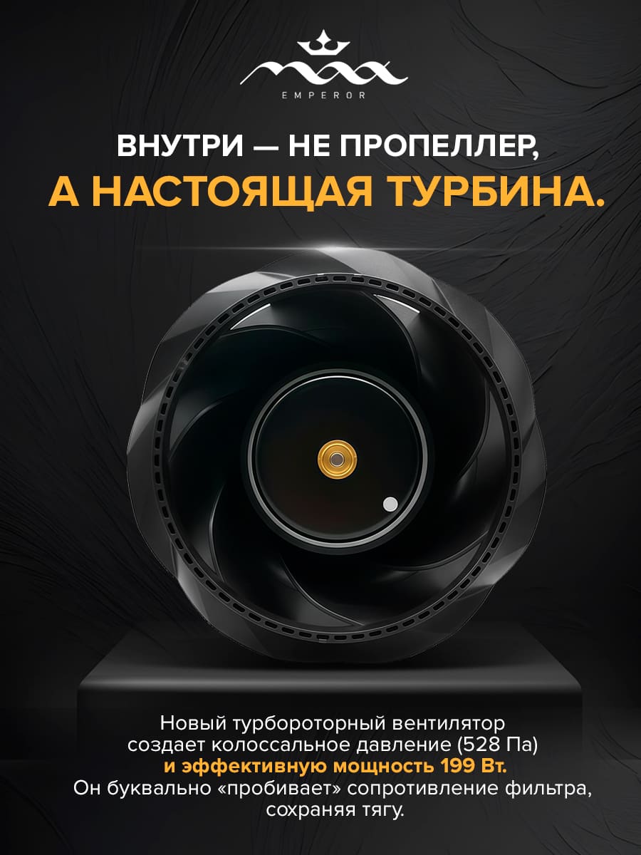 Представляем второе поколение легендарной вытяжки MAX Император. Мы провели глубокую техническую модернизацию, заменив сердце прибора. Теперь он работает на инновационном турбороторном вентиляторе 24В .