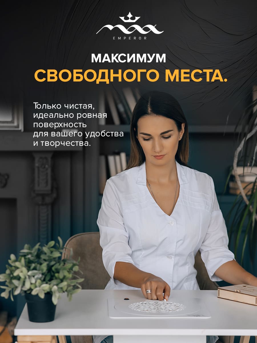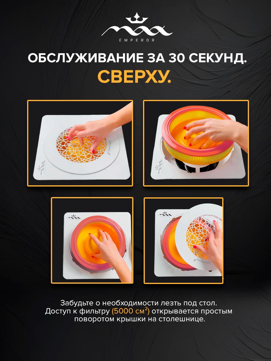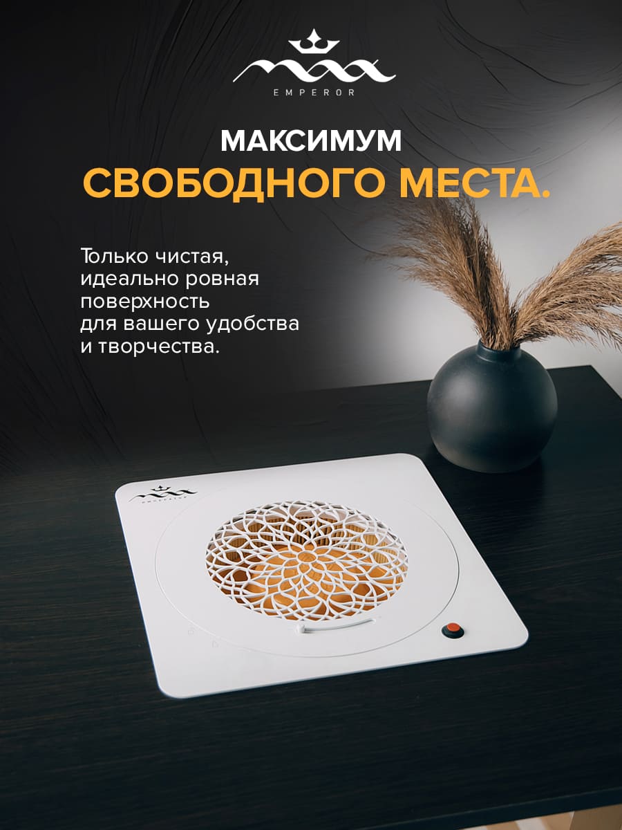 В новом поколении MAX Император (24В) мы отказались от ручного управления в пользу «Умной мощности». Инженеры настроили двигатель на единственную, идеально сбалансированную скорость. Она обеспечивает максимальную силу всасывания при комфортном для ушей уровне шума. Вам не нужно ничего настраивать: нажали кнопку — и вытяжка сразу готова к 100% нагрузке.